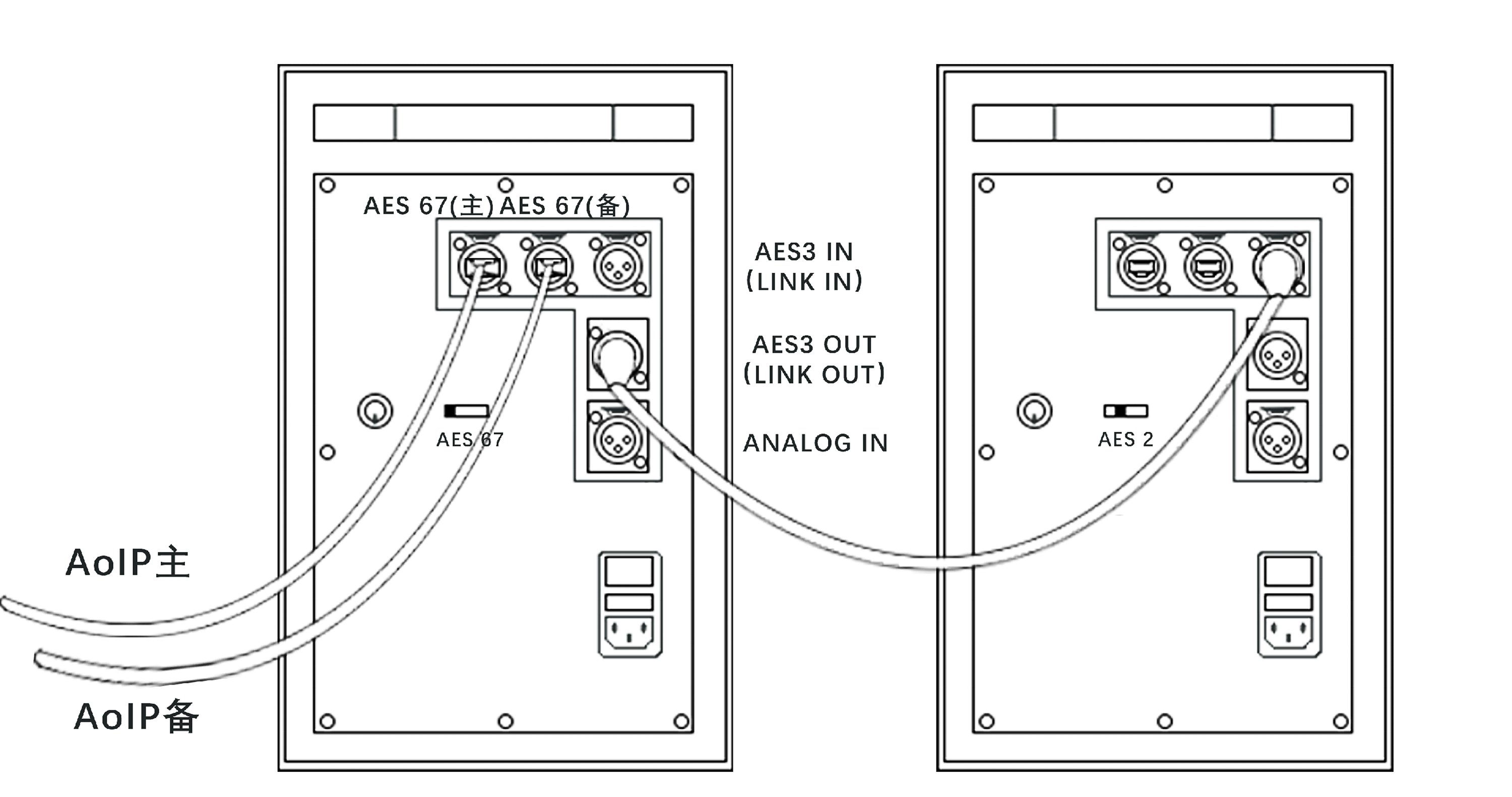 除了单音箱工作模式,MS660i还支持立体声级联模式:通过一根AES/EBU 的LINK电缆捆绑一对MS660i,实现一对AES/EBU或一对AES67信号同时驱动两个MS660i(左右声道)。